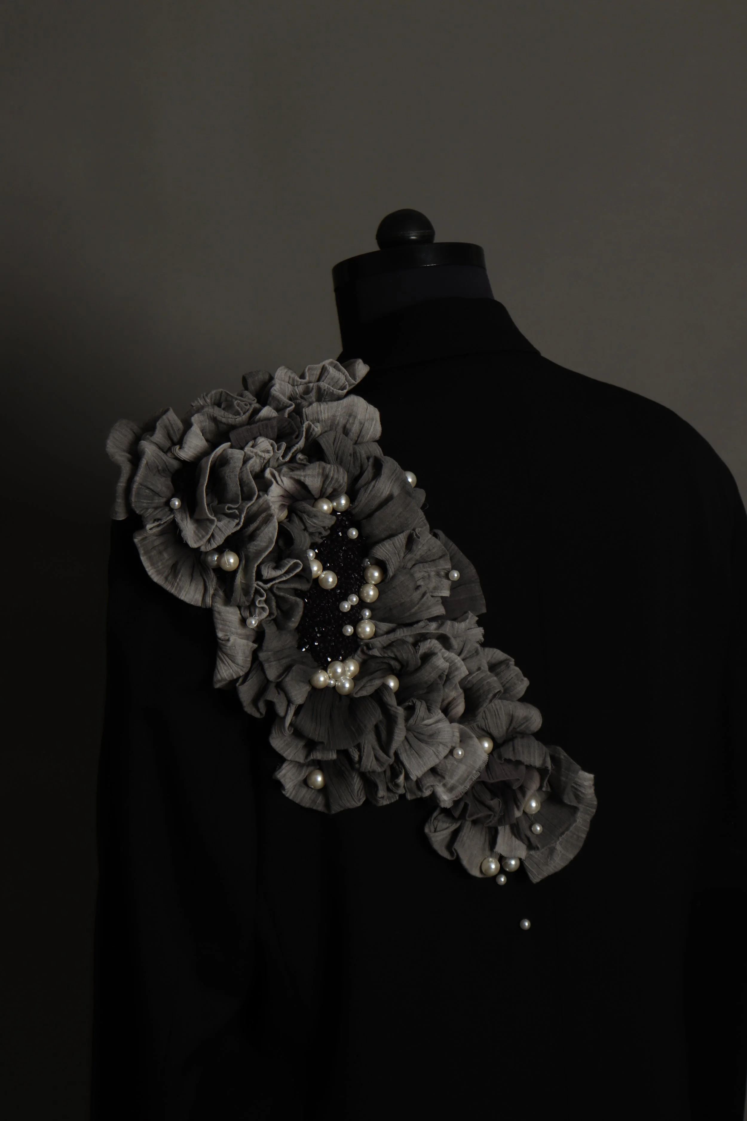 The physical prototype I created was Look 5 of the collection; the stage of growth I am currently in. The embellishment is a plethora of flower petal layers that open in the middle to reveal a crystal core. Signifying that my scars are also a part of my journey, that they also make up the constellations of who I am.